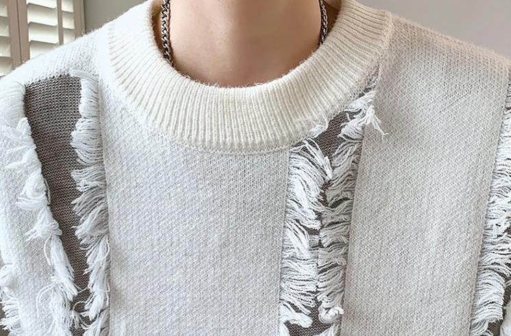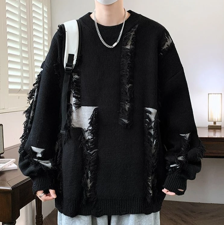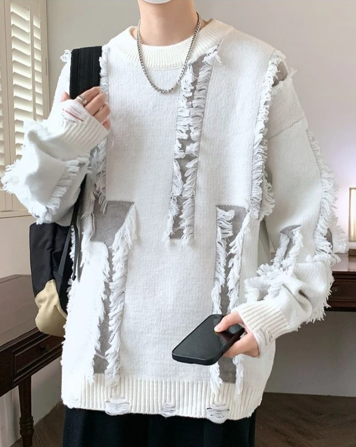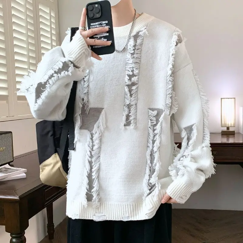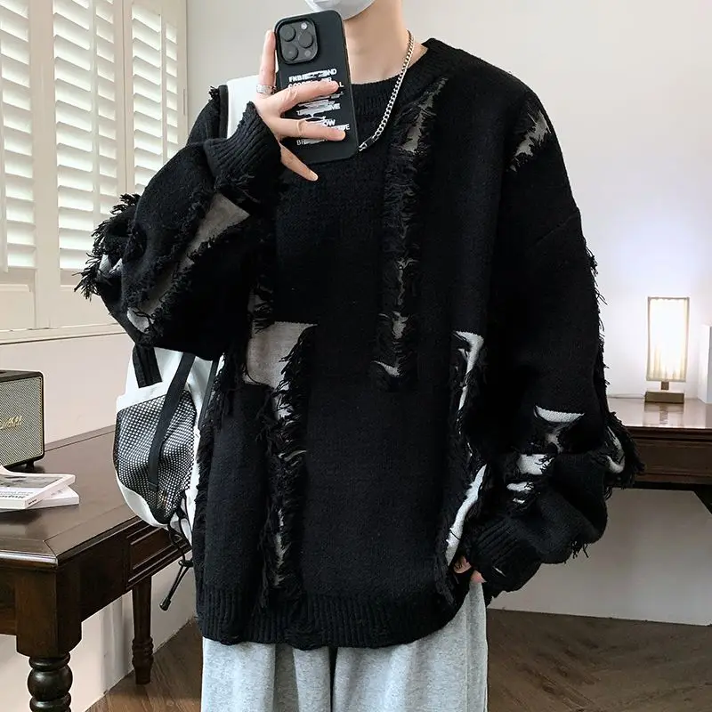 Men's Knit Sweater with Holes Autumnr and Winter Aesthetic Woven Korean Knitwear Popular Clothes Y2k Round Collar Pullovers Male