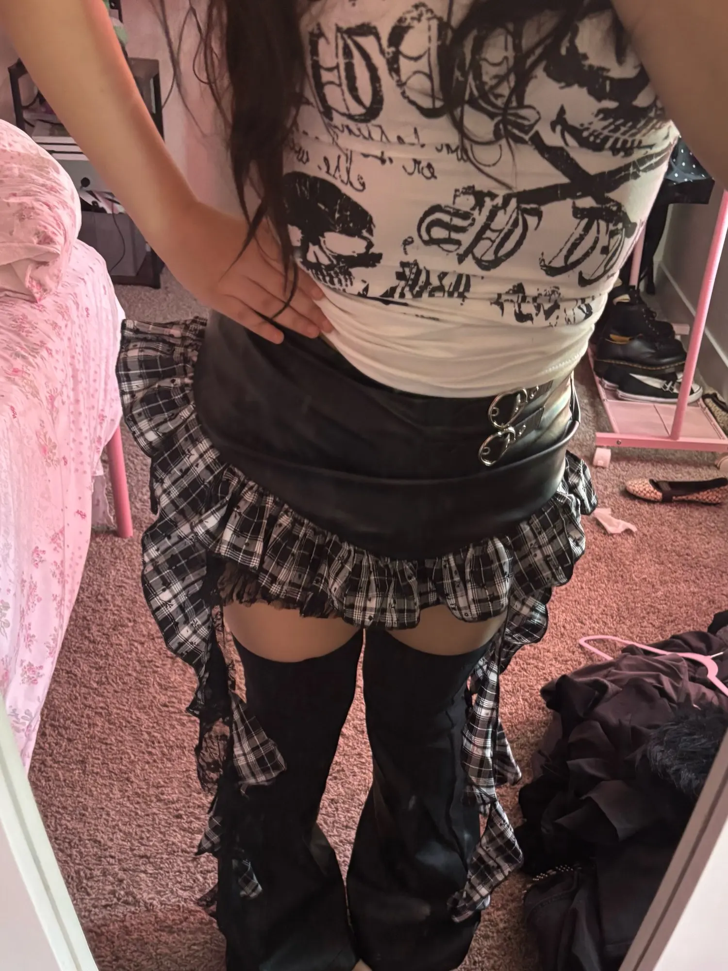 Designed with a short, flirty cut, this skirt showcases the signature style of Y2K fashion—playful, confident, and a little daring. The high-waisted design flatters the figure and creates a sleek, elongated silhouette, perfect for pairing with cropped tops, oversized hoodies, or band tees. The gothic undertones are evident in the skirt’s bold leather accents, offering a darker, edgier vibe without sacrificing the playfulness that the Y2K aesthetic is known for.